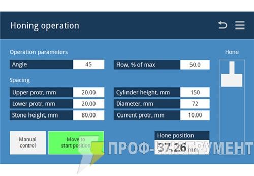 Движение системы хонингования задается поршнем, приводимого в действие гидравлическим блоком, в то время как вращение с помощью мощного электродвигателя.