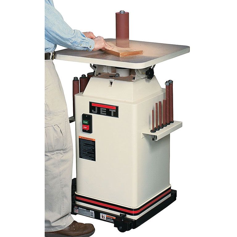 Стандартная комплектация включает в себя 10 шлифовальных шпинделей с диаметром от 6 до 100 миллиметров, а также кольцевые вставки в рабочий стол с круглым и овальным отверстием (для работы в наклонном положении стола). Расходный материал – абразивные гильзы – предлагаются со склада Jet в широком ассортименте.