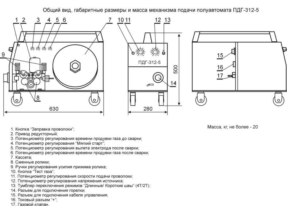 - Плавная регулировка выходного напряжения сварочного источника и скорости подачи электродной проволоки с подающего механизма;