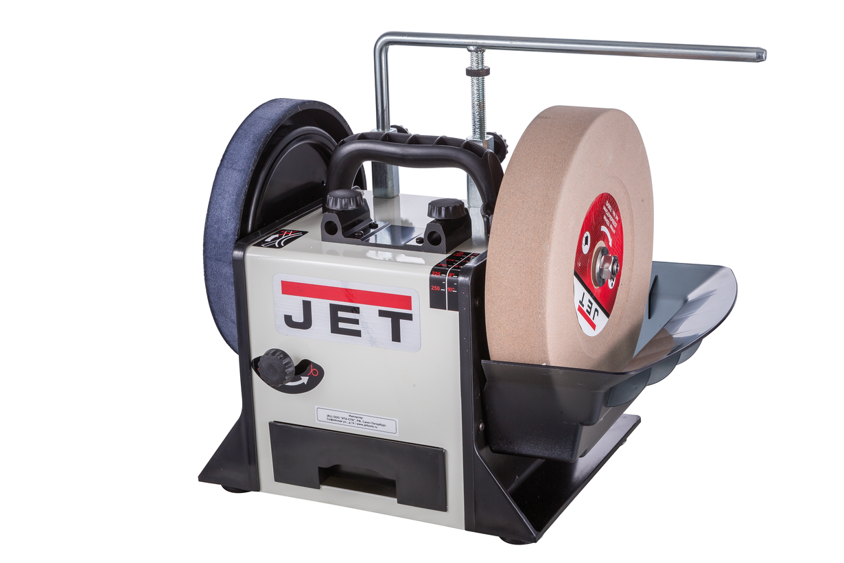 Jet JSSG-10 - шлифовально-полировальный станок для заточки, правки и доводки режущего инструмента (в основном ручного) с высокой точностью и без отпуска режущей кромки. Вал с кругами (абразивным, шлифовальным и кожаным полировальным) вращается с небольшой скоростью, которую можно регулировать при помощи рукоятки на передней панели станка. Шлифовальный камень погружен в ванну для смачивания водой.