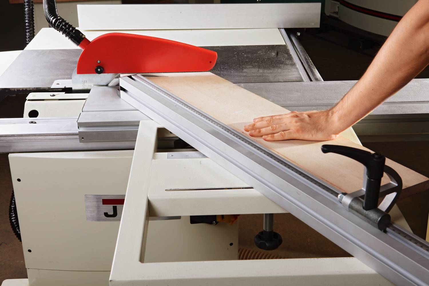 Циркулярная пила Jet JTS-600XL – уникальный по сочетанию характеристик и стоимости станок. Уже в базовый комплект поставки входит подвижный стол (каретка) и расширение к нему. Расширитель укомплектован регулируемой телескопической опорой и торцевым упором заготовки. Торцевой упор выполнен поворотным, что позволяет делать распилы под точно установленным углом. Для фиксации заготовки можно использовать регулируемый концевой ограничитель; в случае ненадобности он откидывается.